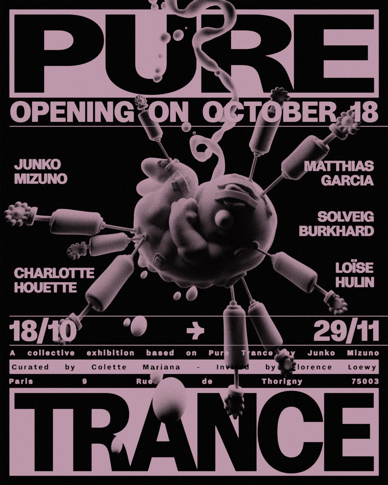 水野のSFファンタジー漫画「ピュア・トランス」にインスパイアされたアート展が、現在パリの Florence Loewy Gallery にて開催中! この展覧会では、キュレーターが選んだアーティストたち・ Solveig Burkhard(ソルヴェイ・ブルクハルト), Matthias Garcia(マティアス・ガルシア), Charlotte Houette(シャルロット・ウエット), Loïse Hulin(ロイズ・ユラン) の作品に加え、「ピュア・トランス」が最初に連載されたCDブックレット版の実物や、そのオリジナル原稿も展示されています。