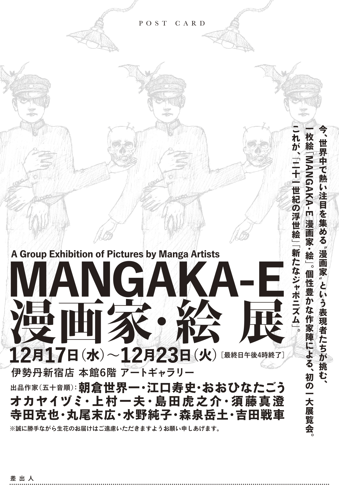 I’m excited to share that I’ll be participating in “MANGAKA-E: A Group Exhibition of Pictures by Manga Artists” a group show featuring 12 manga artists, at Isetan Shinjuku starting December 17!