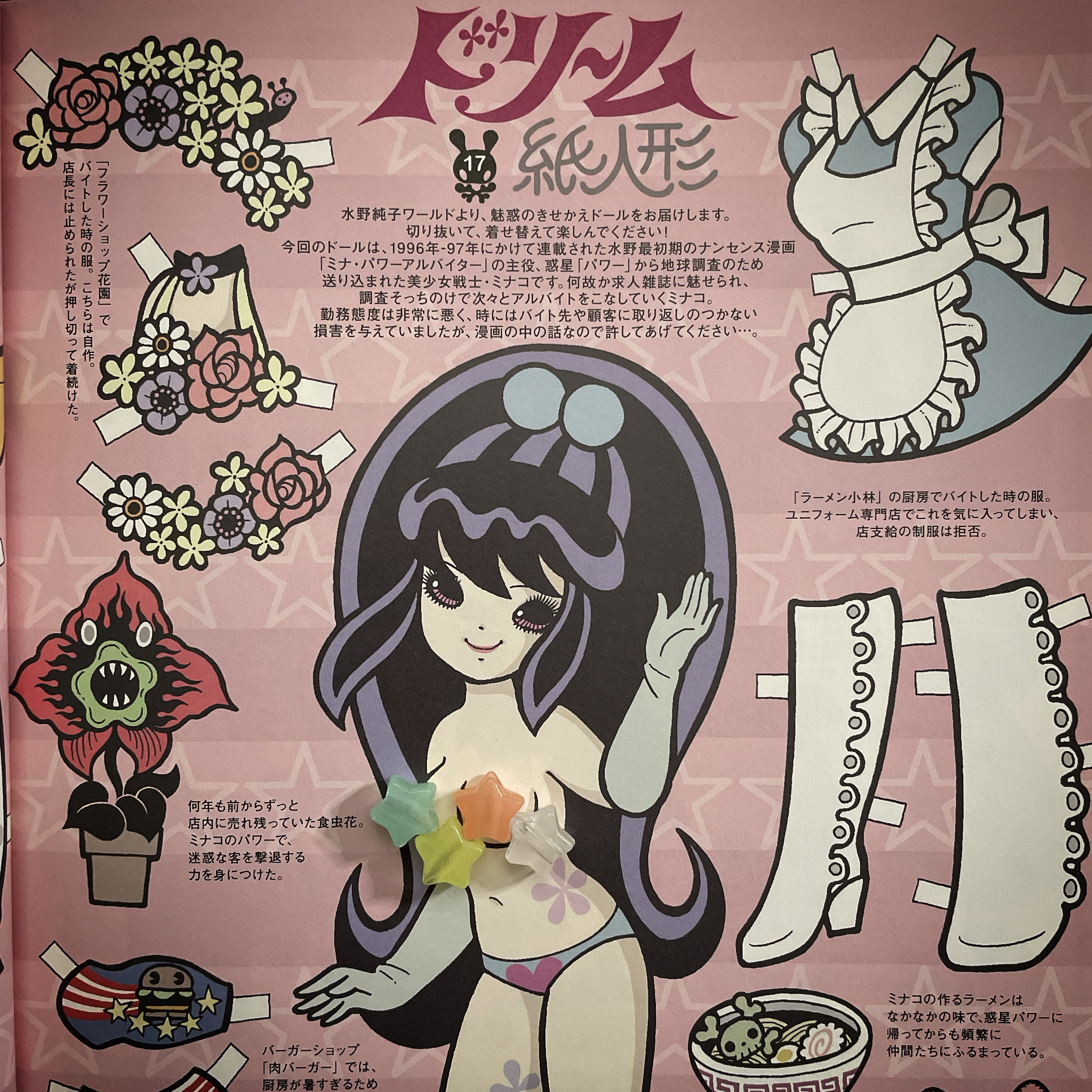 今回のきせかえ人形は、1996年-97年にかけて連載された水野最初期のナンセンス漫画「ミナ・パワーアルバイター」の主役、惑星「パワー」から地球調査のため送り込まれた美少女戦士・ミナコです。何故か求人雑誌に魅せられ、調査そっちのけで次々とアルバイトをこなしていくミナコ...某缶コーヒーのCMの設定に似ている気がしますが、28年前に描いた漫画です!